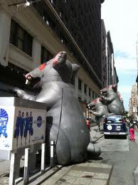 Oftentimes, as you walk about the city, there are huge inflated rats positioned outside certain companies with union workers handing out leaflets to passer-bys. The rat is positioned to highlight where groups feel that labor standards are not being met, including the payment of area standard wages. Supposedly, these rats that have multiplied throughout the city, are called “Scabby The Rat“ originally designed for a Chicago Union in 1990. Talk about another city infested with rats.