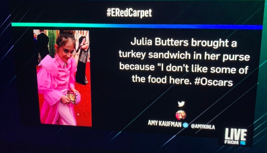 On a completely different front, I loved the young actress, Julia Butters, who brought a turkey sandwich in her purse. My son, were he to attend the Oscars would stuff either chicken nuggets or a slice of pizza, in his suit pockets. Or he would make me carry it in my purse. He might also pull a Jason Derulo and totally fall down the stairs in style. That was actually quite a scary fall and my son went through one this year. Yikes.